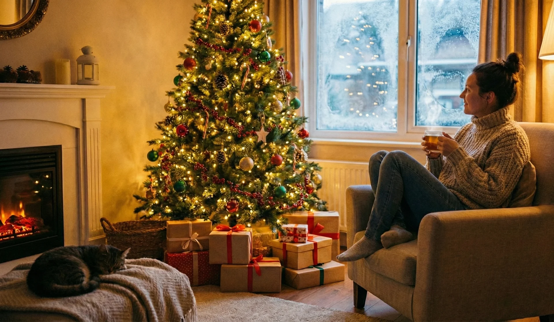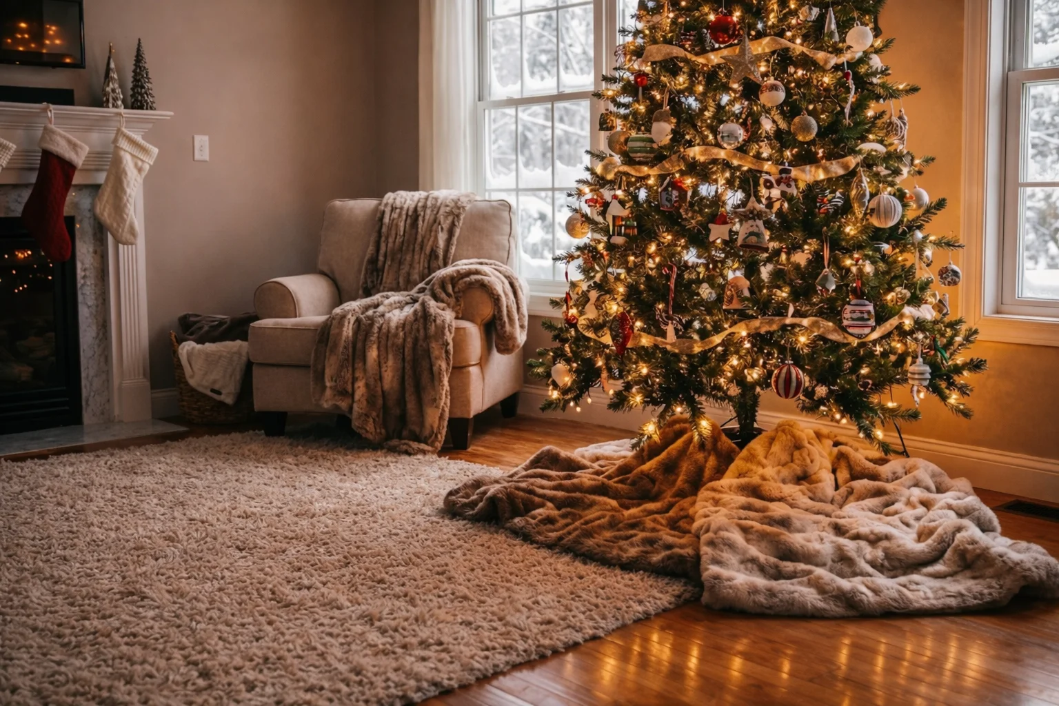 소파, 러그, 커튼 컬러와 오너먼트 톤을 맞추면 집 전체가 하나의 크리스마스 세트처럼 느껴져요. 너무 화려하기보다는 오래 봐도 편안한 컬러 조합이 좋아요.
