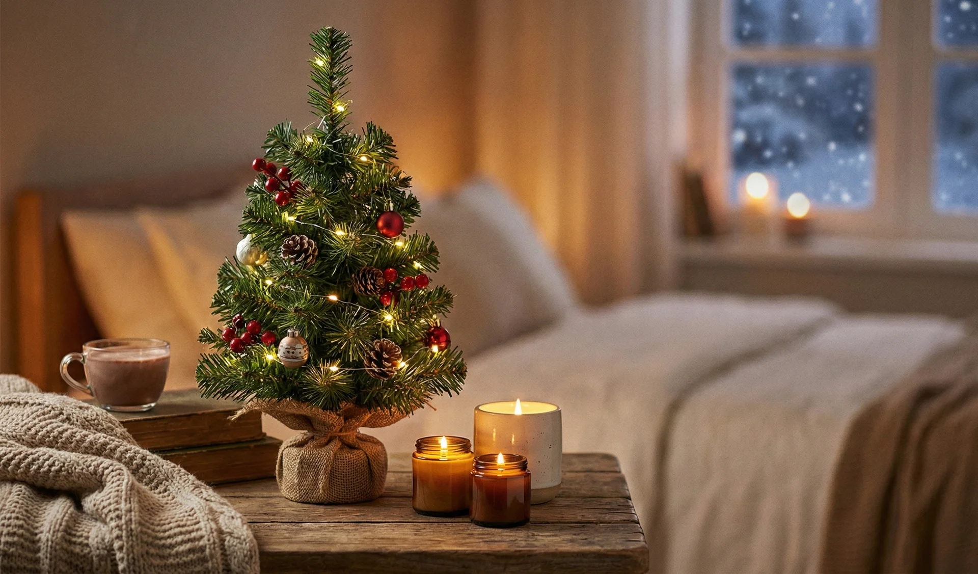 미니 트리에 소형 오너먼트 몇 개, 은은한 조명만 더해도 충분히 겨울 분위기를 낼 수 있어요.