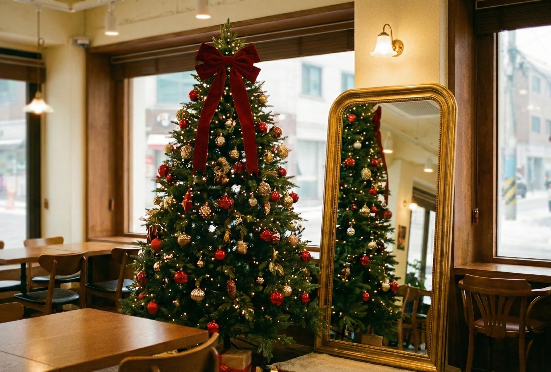 트리 옆에 대형 전신 거울을 배치하면 고객들이 자연스럽게 인증샷을 남기는 명당이 돼요.