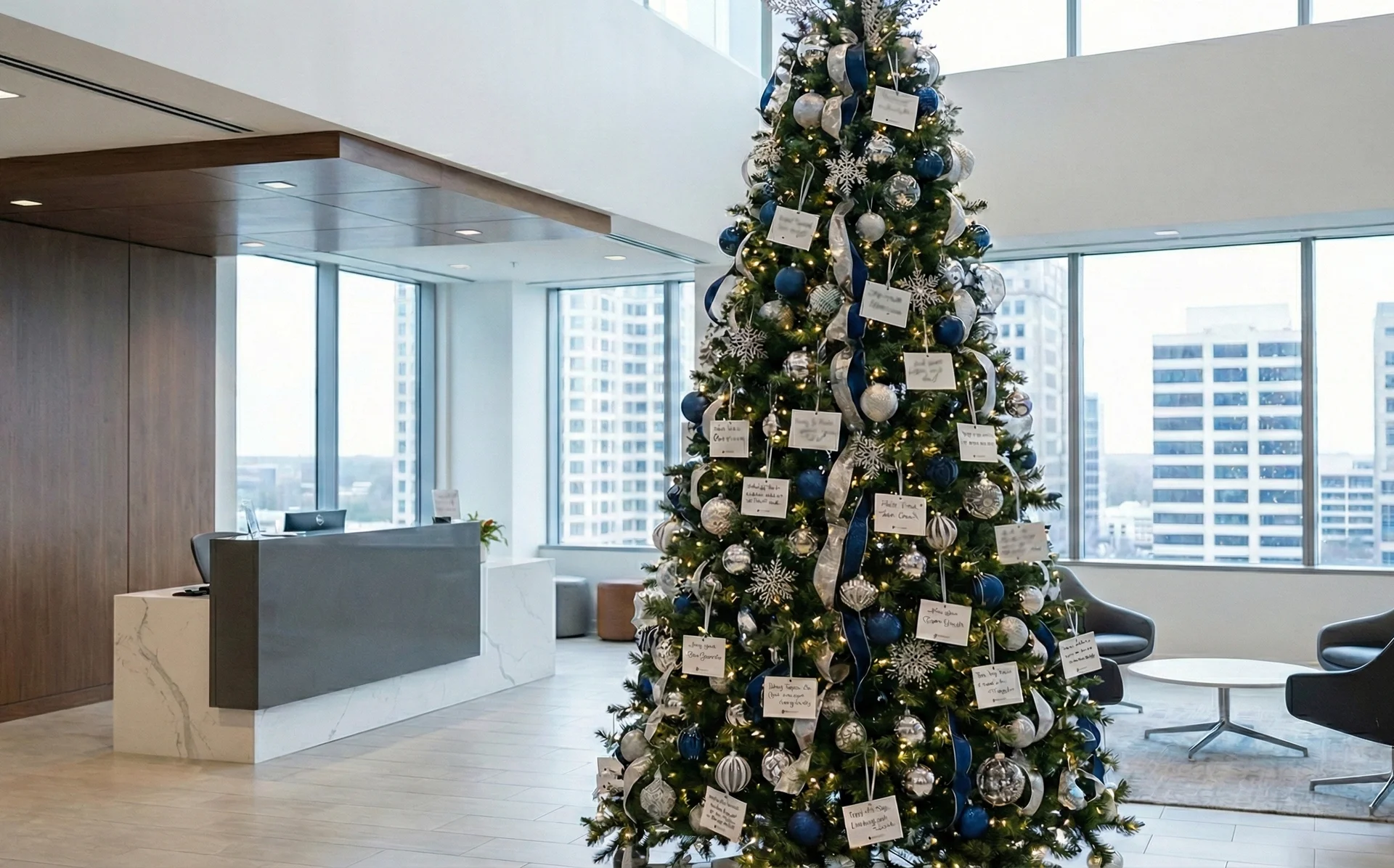 트리 오너먼트 대신 직원들의 새해 소망을 담은 메시지 카드를 걸어 소통의 창구로 활용해 보세요.