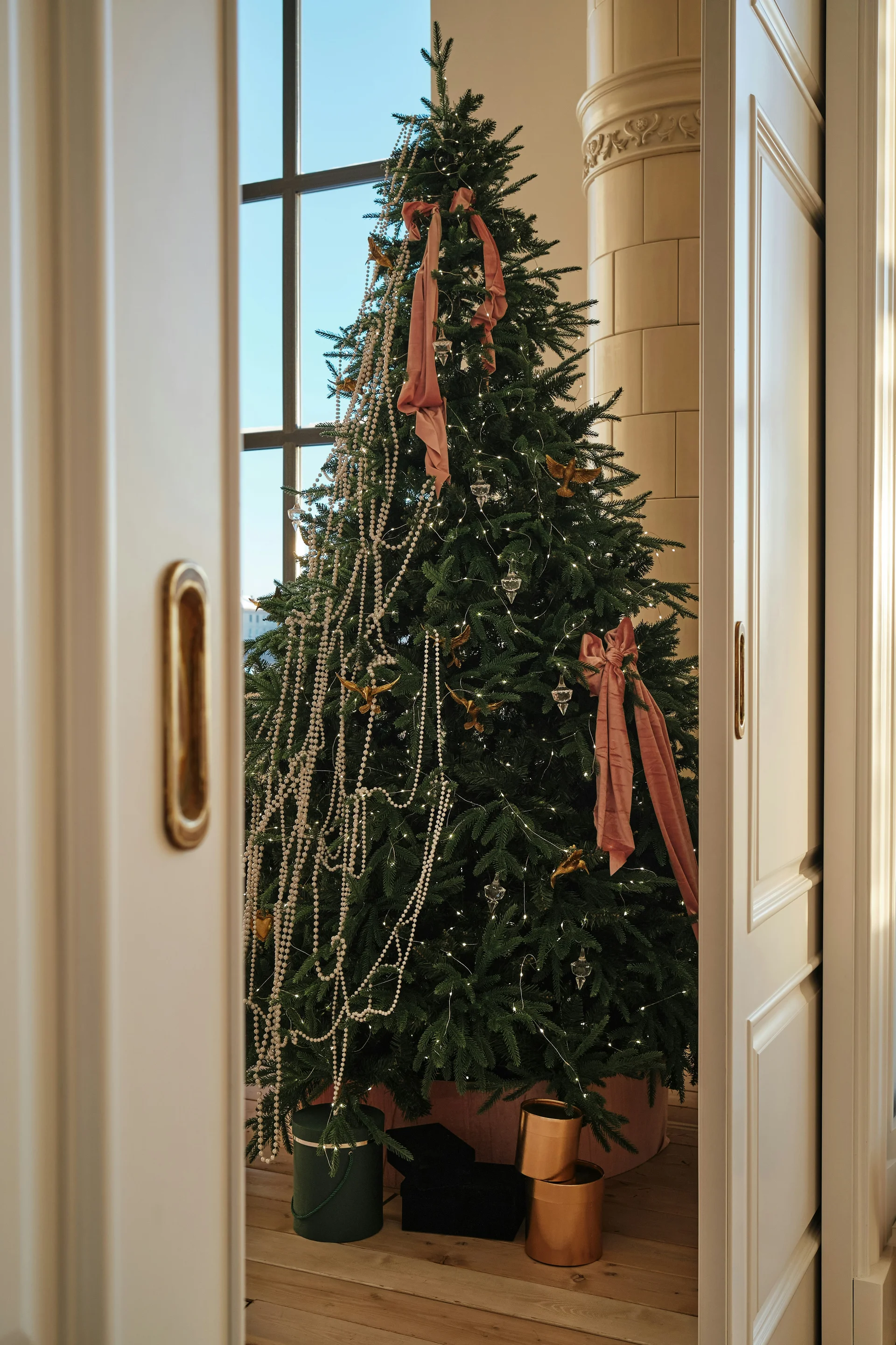 리본을 트리 위에서 아래로 흘러내리듯 배치하고, 12~18cm 간격으로 가지 사이에 집어넣어 보세요. 리본이 차르르 흘러내리는 고급스러운 트리가 완성돼요.